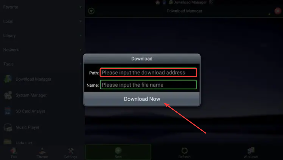 Next, open the app and within ES File Explorer, select Download Manager → New and paste the Live Net TV APK link. Choose Download Now. You can also transfer the APK from your computer via cloud storage if preferred.