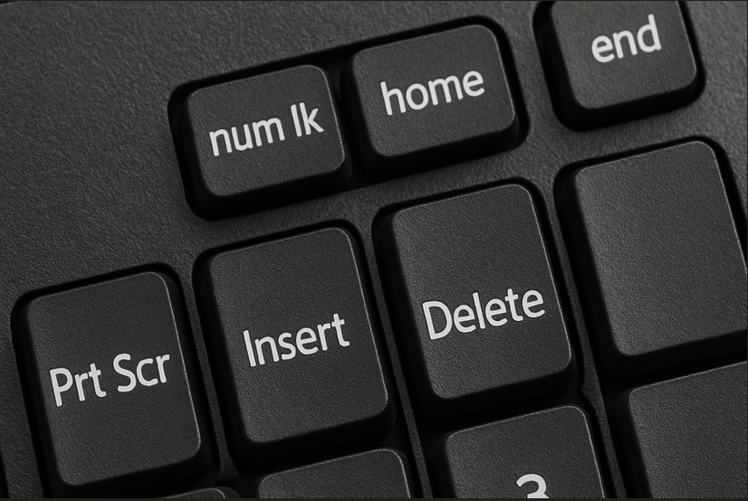Keys like Prt Scr, Insert, Delete, and Pause handle system or editing actions. Prt Scr captures screenshots, Delete removes selected content, and Insert toggles between overwrite and insert typing modes.